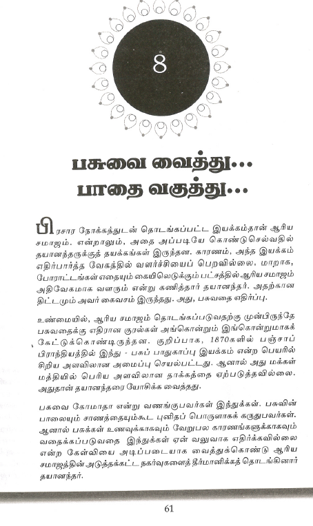 61. பசுவை கடவுளாக வணங்கும் இந்துக்கள் ஏன் பசுவதையை எதிர்க்கவில்லை என்று கேள்வி எழுப்பினார் தயானந்தர்